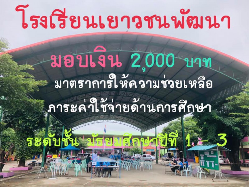 โรงเรียนเยาวชนพัฒนา ได้จ่ายเงินตามโครงการให้ความช่วยเหลือบรรเทาภาระค่าใช้จ่ายด้านการศึกษา(COVID19) อัตรา 2,000 บาท ตั้งแต่ระดับชั้น อนุบาล 1 - มัธยมศึกษาปีที่ 3 ตั้งแต่วันที่ 7 - 9 กันยายน 2564