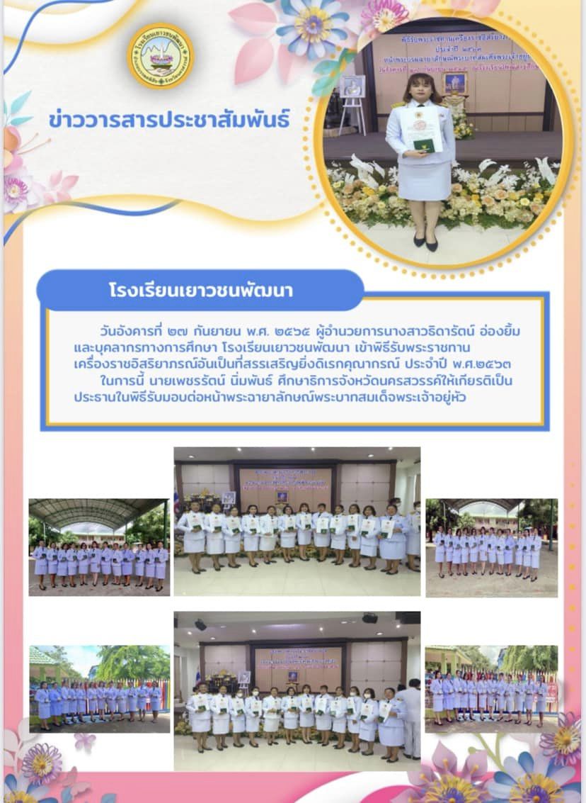 | วันอังคารที่ 27 กันยายน พ.ศ.2565 ผู้อำนวยการ ธิดารัตน์ อ่องยิ้ม และบุคลากรทางการศึกษา โรงเรียนเยาวชนพัฒนา เข้าพิธีรับพระราชทานเครื่องราชอิสริยาภรณ์อันเป็นที่สรรเสริญยิ่งดิเรกคุณาภรณ์ ประจำปี 2563 ในการนี้ นายเพชรรัตน์ นิ่มพันธ์ ศึกษาธิการจังหวัดนครสวรรค์ให้เกียรติเป็นประธานในพิธีรับมอบต่อหน้าพระฉายาลักษณ์พระบาทสมเด็จพระเจ้าอยู่หัว |