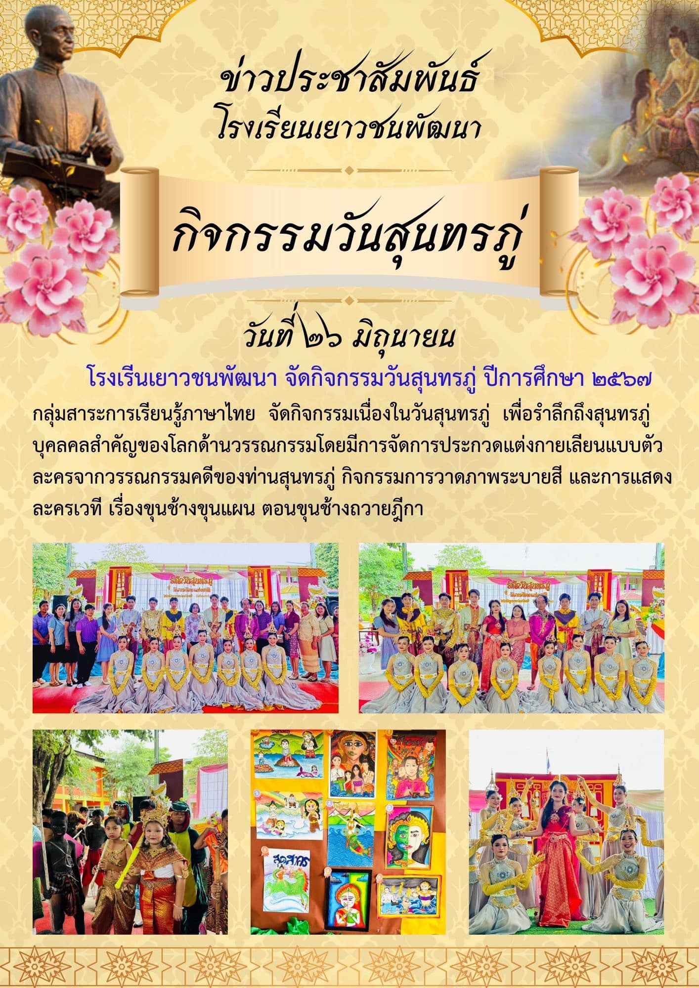 โรงเรีนเยาวชนพัฒนา จัดกิจกรรมวันสุนทรภู่ ปีการศึกษา ๒๕๖๗ กลุ่มสาระการเรียนรู้ภาษาไทยจัดกิจกรรมเนื่องในวันสุนทรภู่ เพื่อรำลึกถึงสุนทรภู่