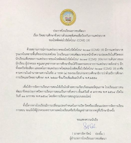 ประกาศปิดสถานศึกษาด้วยเหตุพิเศษ เนื่องจากการแพร่ระบาดของโรคติดเชื้อไวรัสโคโรนา 2019 ( COVID-19 ) ปิดการเรียนการสอนตั้งแต่วันที่ 5 มกราคม 2564 เปิด วันที่ 11 มกราคม 2564