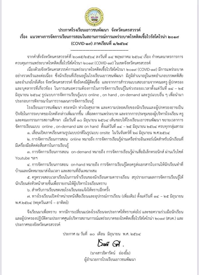 ประกาศโรงเรียนเยาวชนพัฒนา จังหวัดนครสวรรค์ เรื่อง แนวทางการจัดการเรียนการสอนในสถานการณ์การแพร่ระบาดโรคติดเชื้อไวรัสโคโรน่า 2019 (COVID-19) ภาคเรียนที่ 1/2564 (เพิ่มเติมฉบับที่ 1)