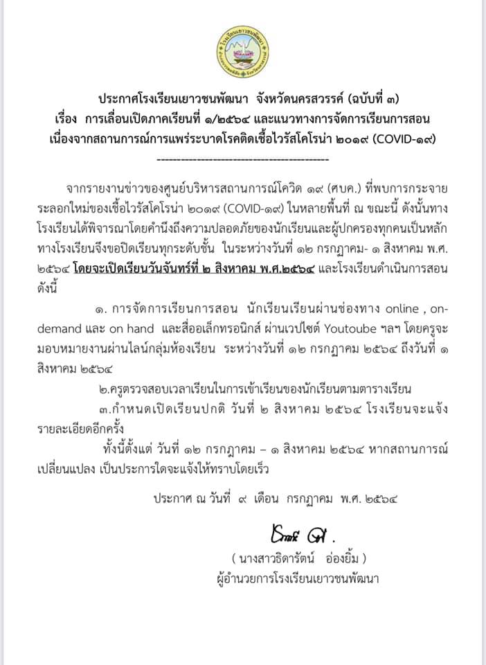 ประกาศโรงเรียนเยาวชนพัฒนา จังหวัดนครสวรรค์ เรื่อง แนวทางการจัดการเรียนการสอนในสถานการณ์การแพร่ระบาดโรคติดเชื้อไวรัสโคโรน่า 2019 (COVID-19) ภาคเรียนที่ 1/2564 (เพิ่มเติมฉบับที่ 2)