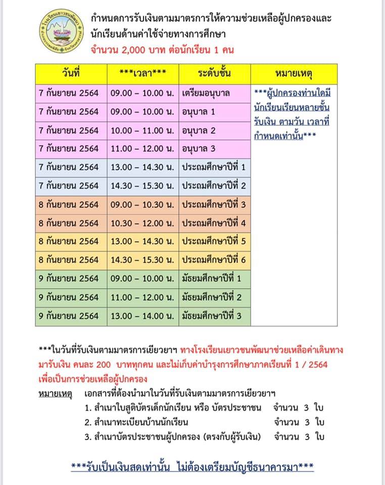 กำหนดการรับเงินตามมาตรการให้ความช่วยเหลือผู้ปกครอง และนักเรียนด้านค่าใช้จ่ายทางการศึกษา 2,000 บาท