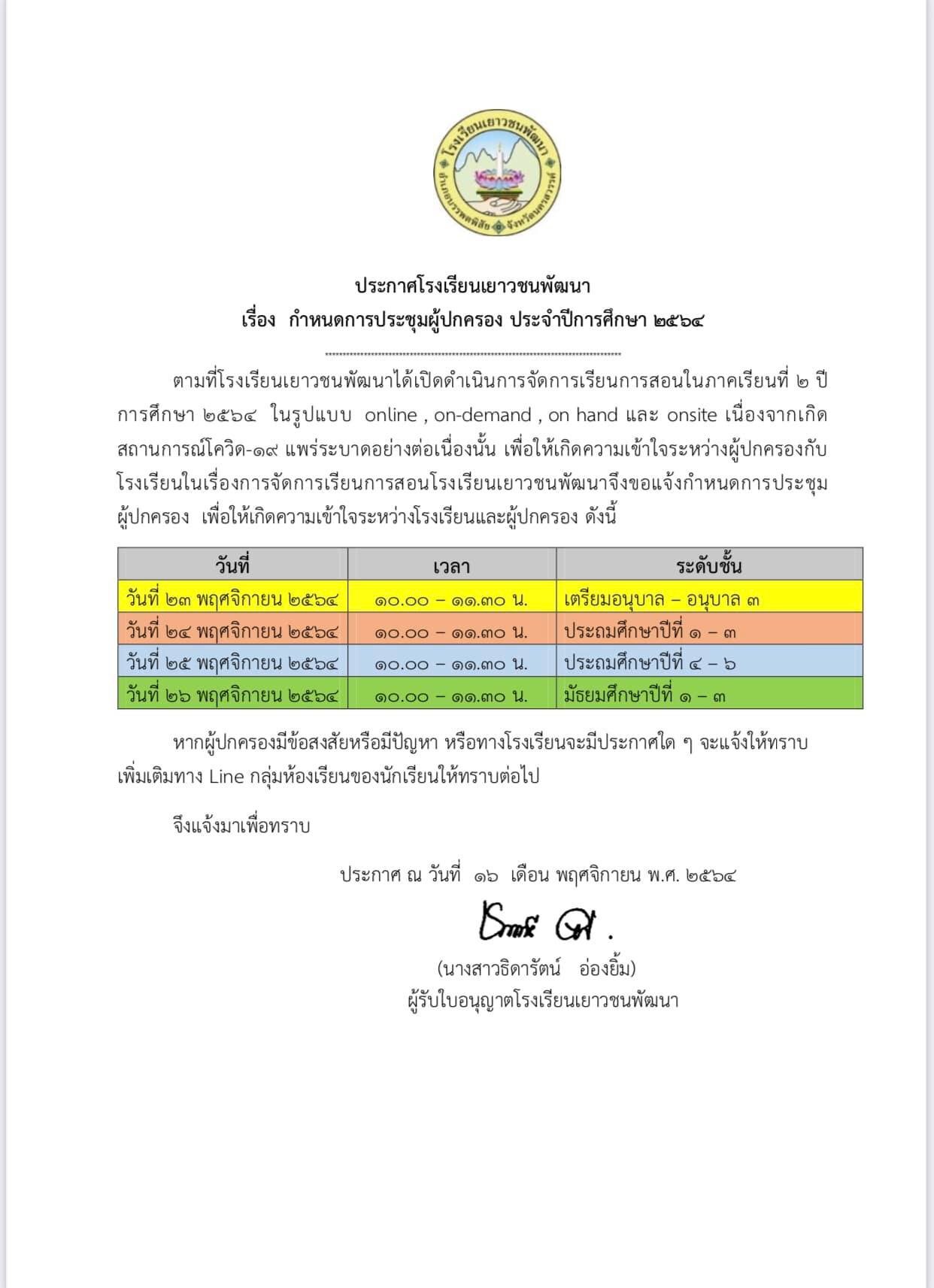 กำหนดการประชุมผู้ปกครอง ประจำปี ๒๕๖๔ โรงเรียนเยาวชนพัฒนา