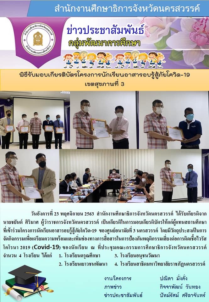 | โรงเรียนเยาวชนพัฒนา ได้รับมอบเกียรติบัตรแกนนำนักเรียนอาสารอบรู้ป้องกันภัยโรคโควิด-19 ประจำโรงเรียน โดย นายชยันต์ ศิริมาศ ผู้ว่าราชการจังหวัดนครสวรรค์ เป็นผู้มอบ ณ ห้องประชุมแสงเทียน ศึกษาธิการจังหวัดนครสวรรค์ วันที่ ๒๓ พฤศจิกายน ๒๕๖๔ |