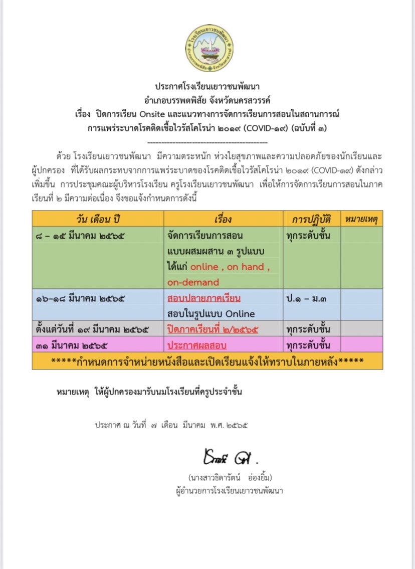 ประกาศโรงเรียนเยาวชนพัฒนา กำหนดการต่างๆของโรงเรียน